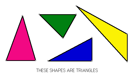There are many different ways to make triangles. They are different sizes and have different lengths of lines, but they all have three sides. Look at this picture to see the different kinds of triangles.